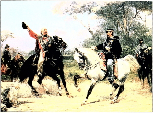 ウルグアイでのガリバルディ 1834年、青年イタリアが崩壊してガリバルディもサルデーニャ海軍を脱走、イギリス人船員になりすまして1835年、マルセイユから乗船してブラジルのリオ=デ=ジャネイロに向かった。南米での亡命生活は28歳から40歳までの13年間に及んだ。ブラジルに着いた頃、南部のリオ・グランデ・ド・スール地方で分離独立運動が起こっていた。ガルバルディはただちに運動に加わり、私掠船の船長となってブラジルと戦った。その大義名分は黒人奴隷制を続けているブラジルで、奴隷を解放することだった。しかし、独立運動は内紛のために失敗に帰し、1841年、拠点をウルグアイに移し、首都モンテビデオでウルグアイ軍に投じてイタリア人移民を組織して「イタリア軍団」をつくり、アルゼンチンとの戦争を指揮した。ガリバルディのイタリア軍団は各地でアルゼンチン軍を破り、その報道はイタリアにももたらされ、知られるようになった。