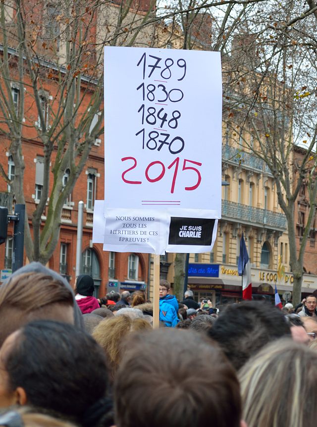 2015年1月7日、パリの週刊誌発行元シャルリー=エブド社がイスラーム過激派に襲撃され、12人が死亡するという事件がおこった。襲撃の理由は同誌がイスラーム教の預言者ムハンマドを諷刺するマンガを掲載したことだった。この事件は政教分離を原理とするフランスでは、いかなる宗教的権威であっても諷刺するのは表現の自由であるとしてエブド社を擁護する声が強く、イスラーム過激派に対する非難が渦巻いた。オランド大統領もテロを蛮行と非難し、表現の自由を守ることを訴えた。多くのパリ市民はテロによる表現の自由への侵害に対し、je suis charlie 「私はシャルリー」と書いたプラカードを手に抗議集会を開いた。その動きはただちにフランス全土、ヨーロッパ各地やアメリカに広がり、同様の集会が各地で開かれた(下の写真)。一方、イスラーム圏ではムハンマド風刺画はゆるされない冒瀆であるとして激しい抗議デモが起こった。そもそも偶像崇拝の否定を徹底しているイスラーム教ではムハンマド像を描くこと自体が禁止されている。現代世界においても、政教分離と表現の自由を掲げる文明と、信仰を唯一の価値基準とし戒律を重んじる文明が対立していることをまざまざと見せつけた事件だった。さらに同2015年11月13日にイスラーム過激派がパリ同時多発テロを決行、130人が犠牲となるという報復がなされた。